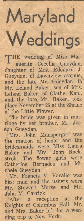 WELCOME TO JOHN BAKER PAGEJon Leland Baker was the husband to Marguerite Gueydan.![]() Jon was the son of Leland Baker and _______?. He married Marguerite Cecelia Gueydan.He was born on 10 Dec 1934 in Olathe Kansas. He was wed on 11/26/1959 This news clipping discribes the wedding. in Shrine of the Little Flower Baltimore Md. He died on 28 Jul 1995 in Naperville Illinois The only child of Jon Baker and Margie Gueydan are: David Baker, b. 01 Oct 1960, d. Living. ![]() | ||||||||