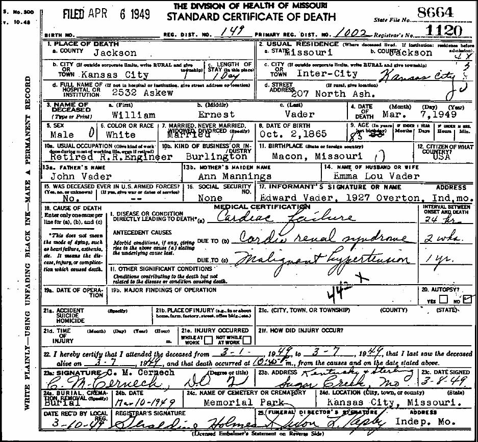 Welcome: This is the second wife of William Ernest Vader. Emma was the 3rd child of Frank Houk and Martha Ellen Prine. Emma's mother died when she was only 5 or 6 and father soon married Cora Isabelle pace. At the age of 20 Emma married William Ernest Vader. William had three children from his previous marriage to Almedia Means. I discovered the Vader Genealogy website created by Elgin Vader. It has everything you could hope for on the Vader family. Link down! On 18 Dec 1924 Emma and William had a son of their own, Edward Vader.
