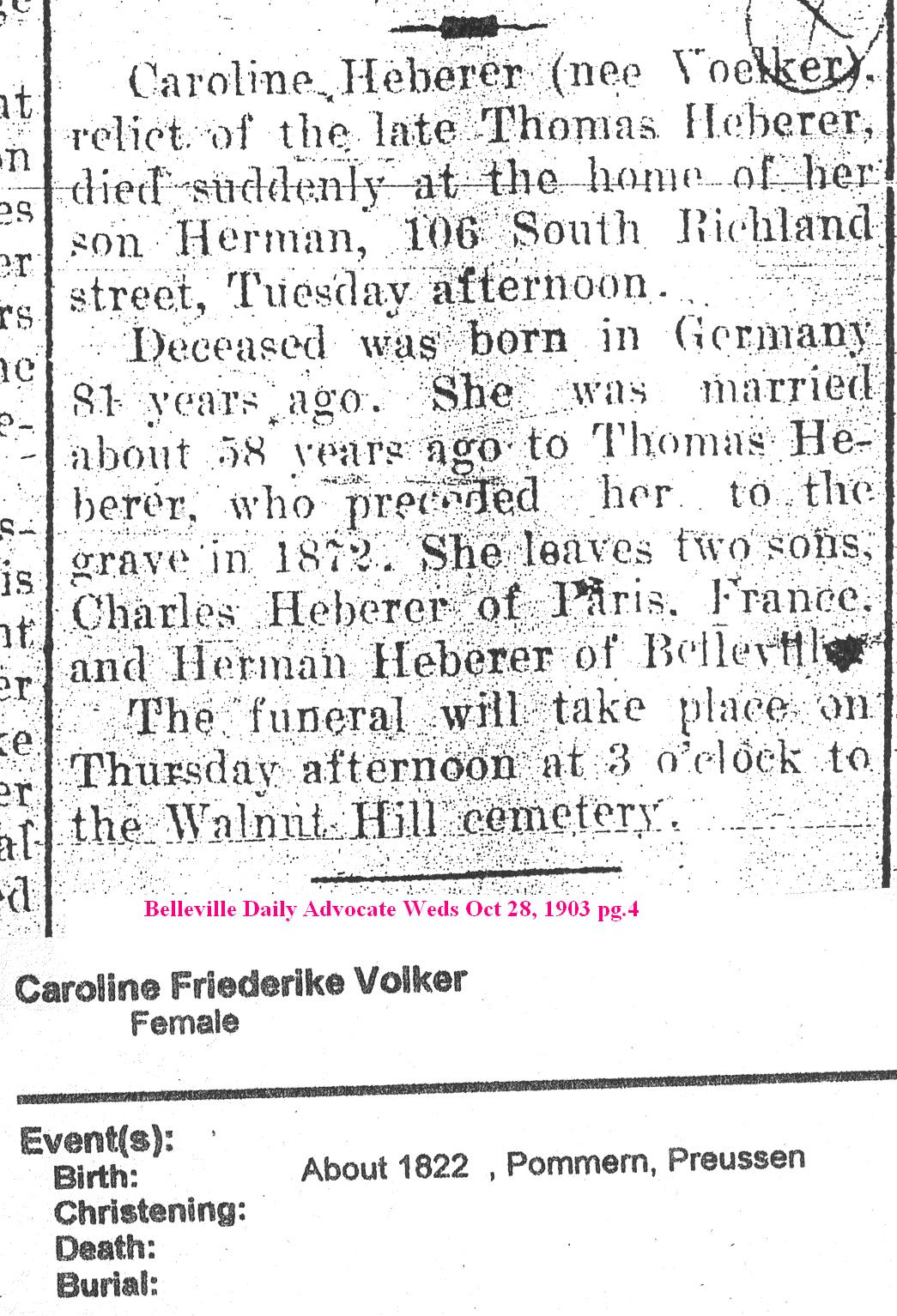 Caroline Fredicker was a native of Pfalz Bayern. She was the daughter of JOANNES HENRICUS VOELKER and ANNA MARIA FLEISCHBEIN. Born about 1822 she was the youngest of at least 3 children. At the age of 16 she braved a crossing of the Atlantic with her family on August 6th 1839. I have their paper of travel. It's a Reise-Pass from Bayern for travel to Nord America. It says Caroline came here with her father and two other children. Phillipina Voelker and the other name is not legible. It says they landed in Havre de Grace. Once here I would guess they traveled west by steamboat. Baltimore was a port town with steamboats going to locations all over America. I can only guess at why their destination was the Midwest. Anne had relatives in New Orleans and in Belleville Illinois. They were doing well and may have contacted the family and told them to come to America. As for her father's side I have not found any relitives living in the midwest at that time. I also have to assume that her mother had past prior the the family coming to America.